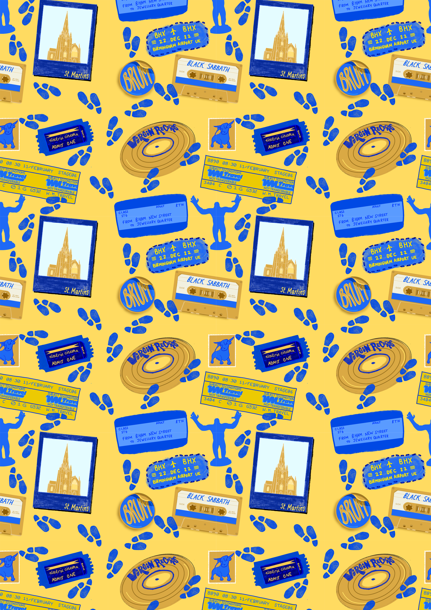A live university project for Birmingham Design, illustrating a pattern which can be used for products within their shop located within the jewellery quarter. Featuring Birmingham themed imagery, the pattern tells the story of a journey through time within the city, using retro bus tickets and old statues to create a sense of nostalgia, so a wider audience can relate to the design.